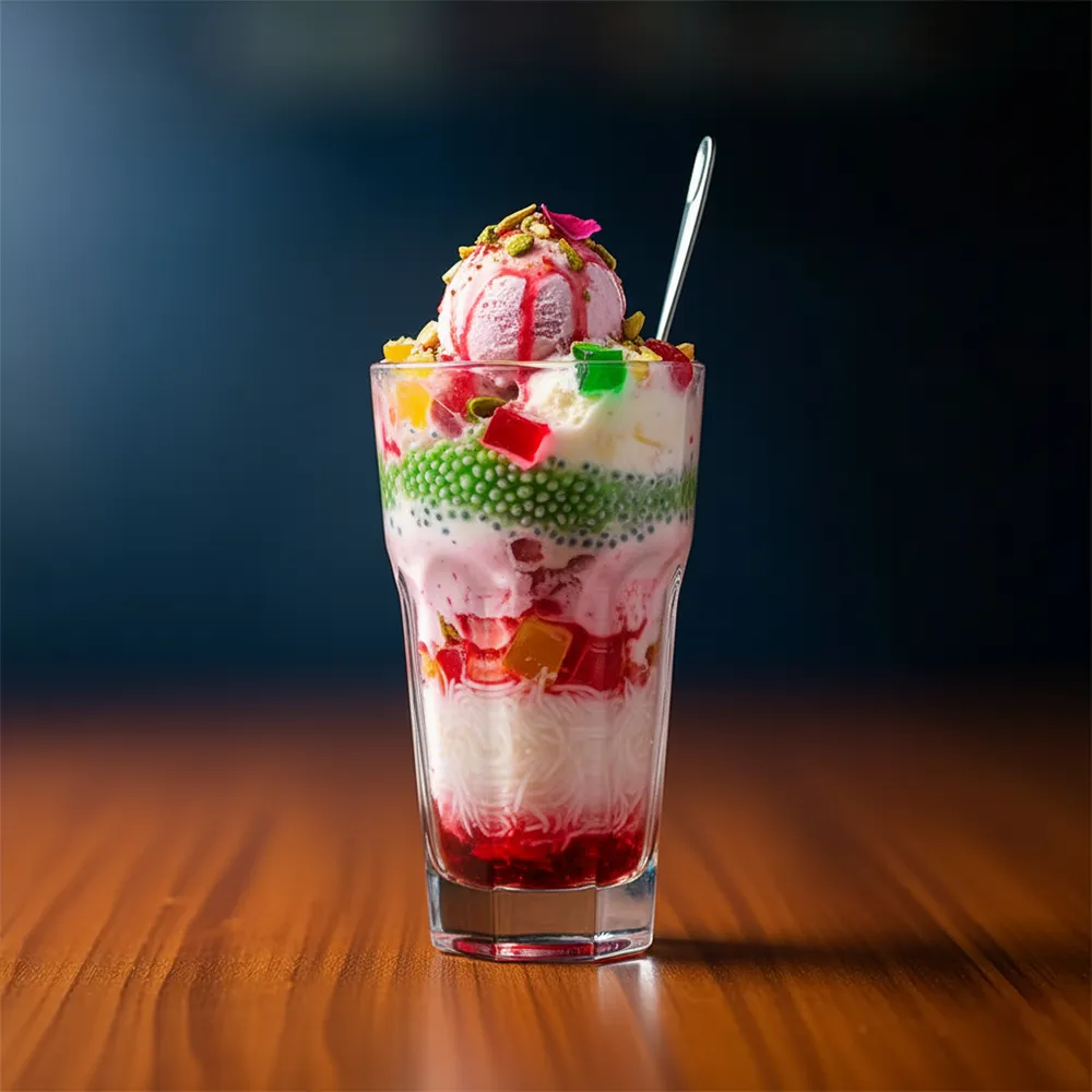 Thin vermicelli, sugar, rose syrup in milk, topped