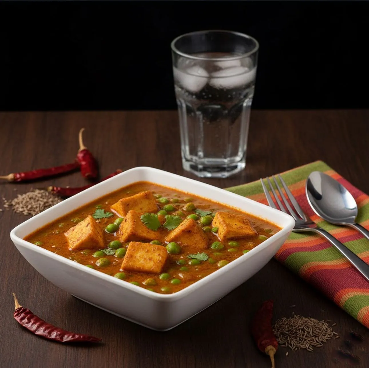 Mattar and cheese in tomato sauce, spices