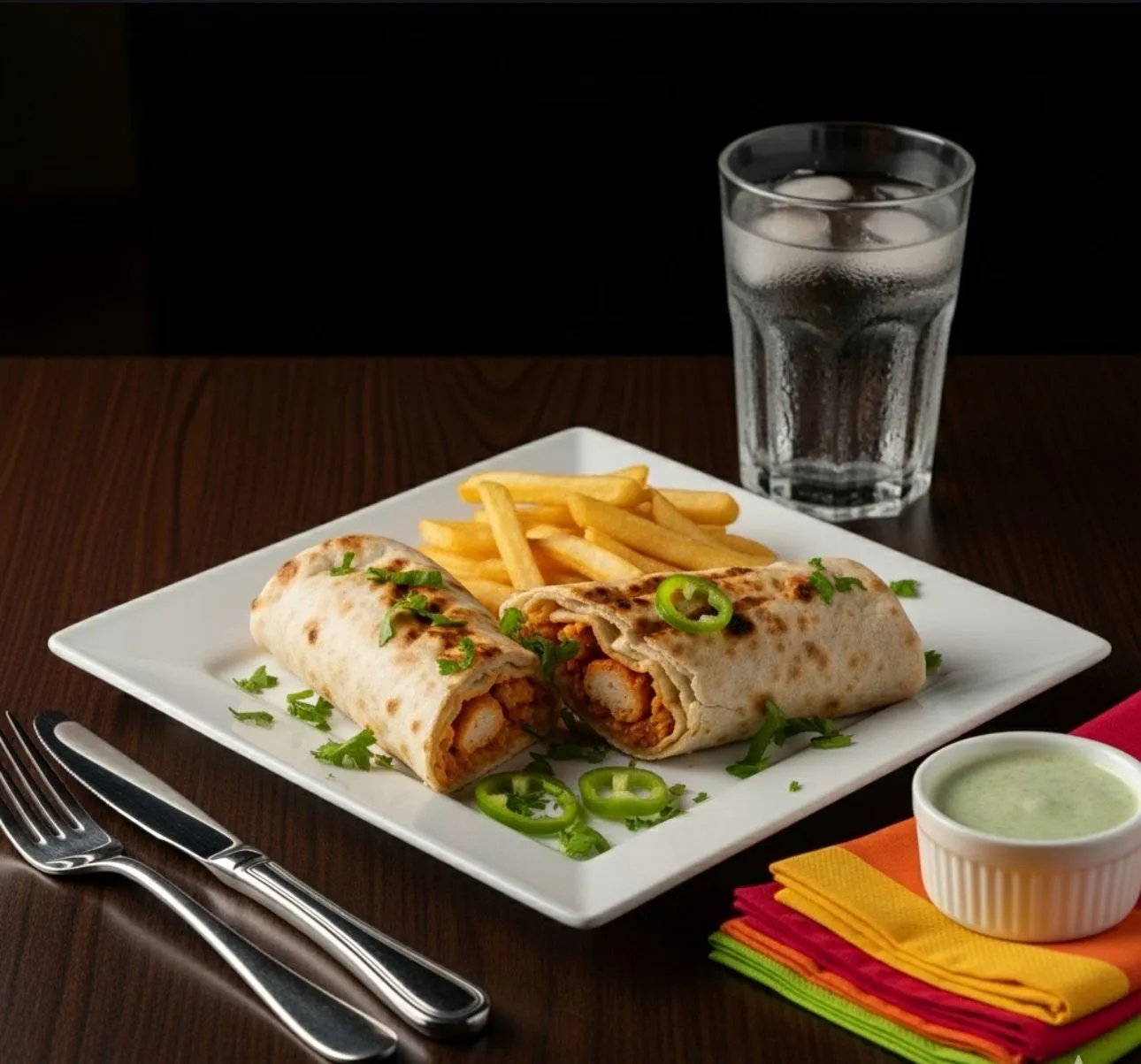 Naan kabab roll served with homemade french fries